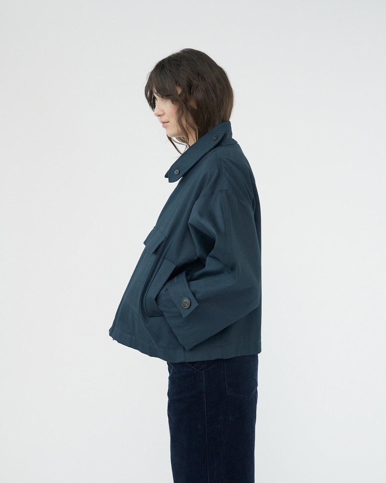 En vannresistent jakke i bomullstwill fra AF AGGER, med mørke hornknapper og innerkrage i kordfløyel.