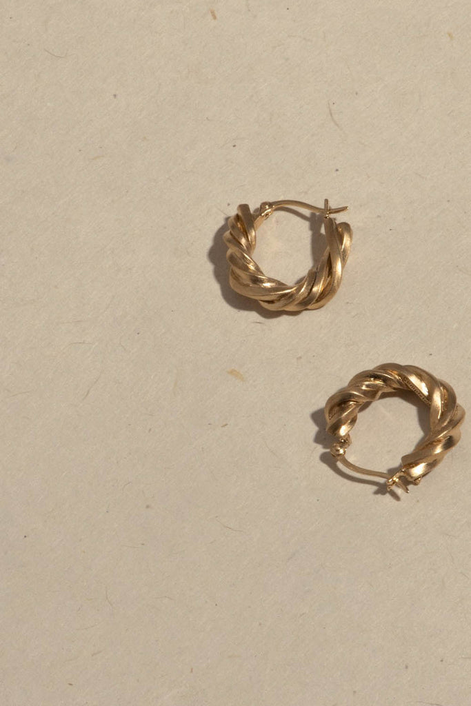 Små strenger av gullbelagt sølv er tvistet rundt hverandre for å lage disse skjønne øreringene.