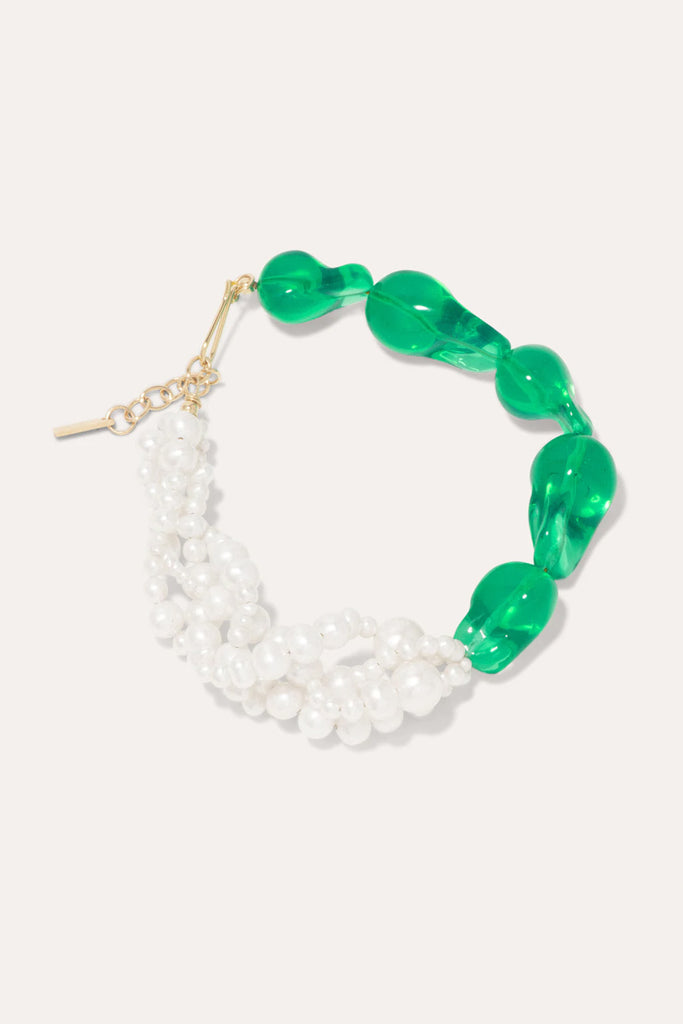 Et elegant armbånd med små, tvunnede ferskvannsperler som er forbundet med en remse grønne resin-perler.