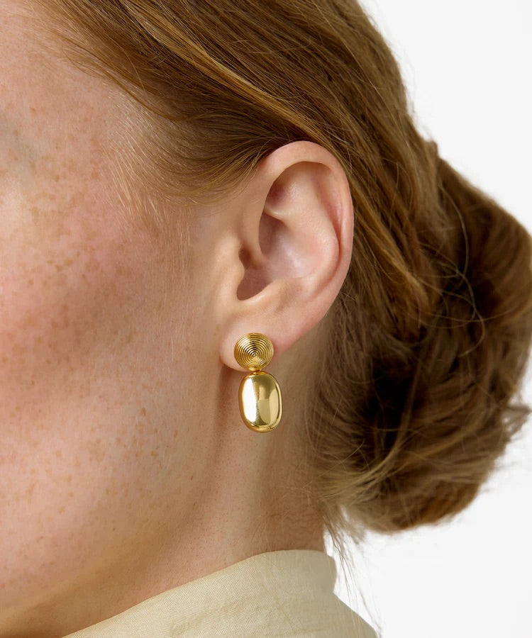 The Carla Earrings fra Lié Studio kombinerer et delikat stud-element med en elegant oval droppform, og skaper et lekent, men samtidig sofistikert uttrykk. I gullforgylt sterlingsølv får øredobbene en varm glød som gjør dem perfekte fra dag til kveld. Designet i København og håndlaget, bærer de preg av skandinavisk minimalisme med tydelig karakter.