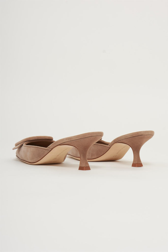 Maysale ble introdusert i 1991 og har raskt blitt én av de mest gjenkjennbare skoene fra Manolo Blahnik. Maysale er en enkel og sofistikert mule og er utsmykket med en spenne i semsket skinn. Dette blir raskt en favoritt i sommerhalvåret til jeans, skjørt og kjoler.