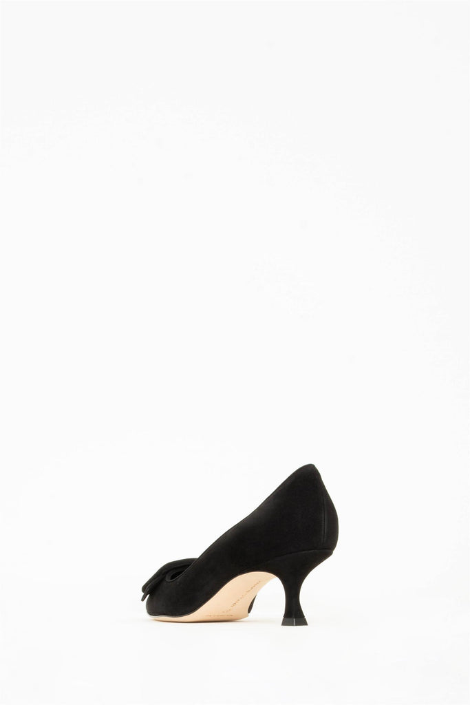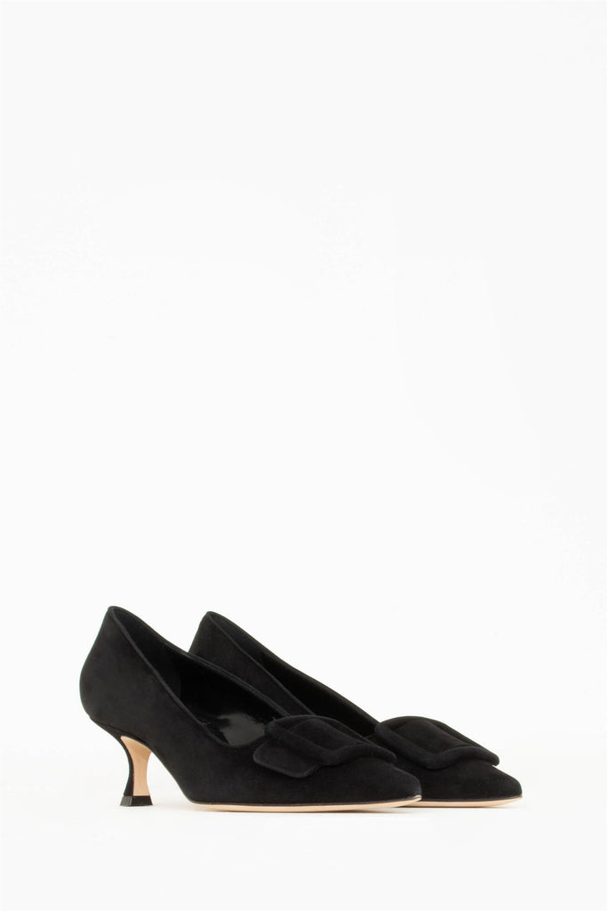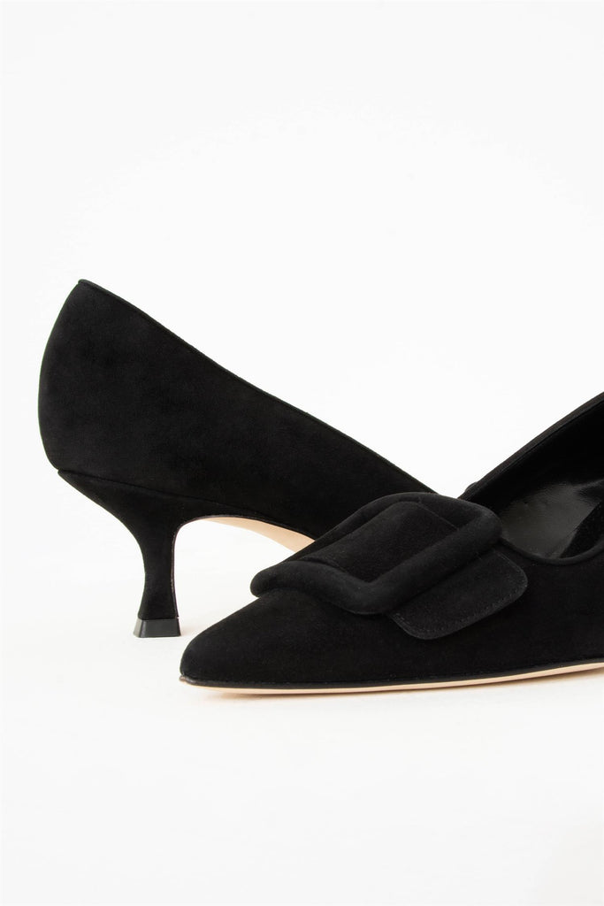 Maysale ble først produsert og introdusert i 1991 på forespørsel fra Isaac Mizrahi som ønsker en enkel sko med pilgrim-spenne. Blahnik kom opp med en perfekt silhuett, som idag er en av de mest ikoniske skomodellene til merket. Her er den i lukket versjon.