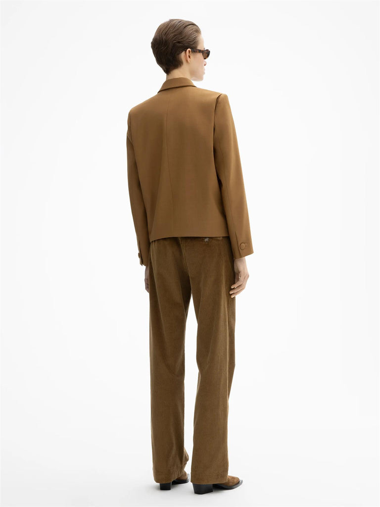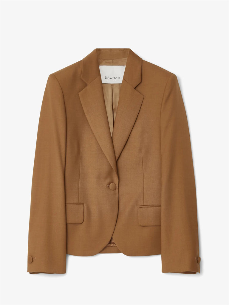 Tettsittende enkelspent blazer laget av lett ullstoff med hakkeslag, klafflommer foran, knapper i skallstoff, og folder bak for en avrundet silhuett. Fullt fôret.