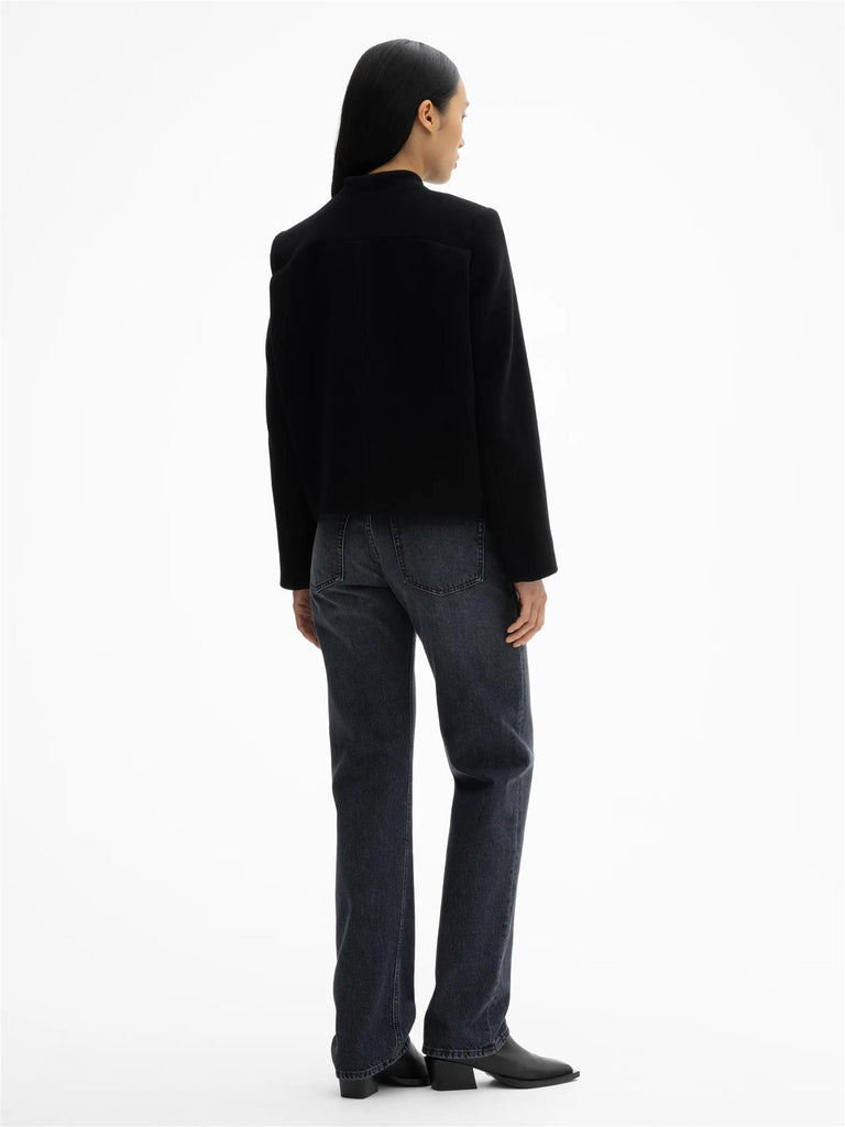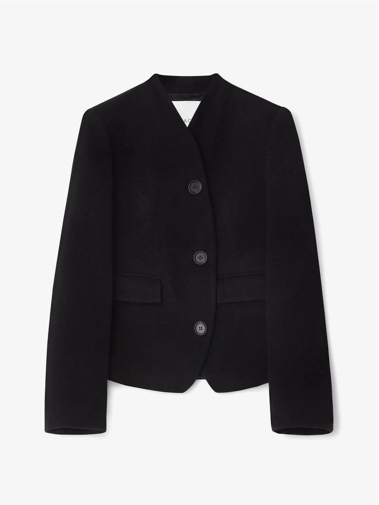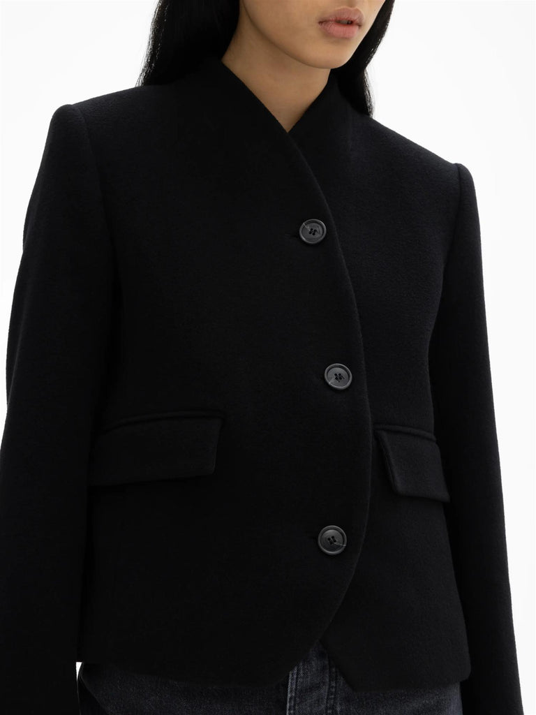 Skreddersydd jakke med stående krage, laget av italiensk ull, med buet frontlukking, klafflommer og knivfolder bak for en avrundet look. Fullt fôret.