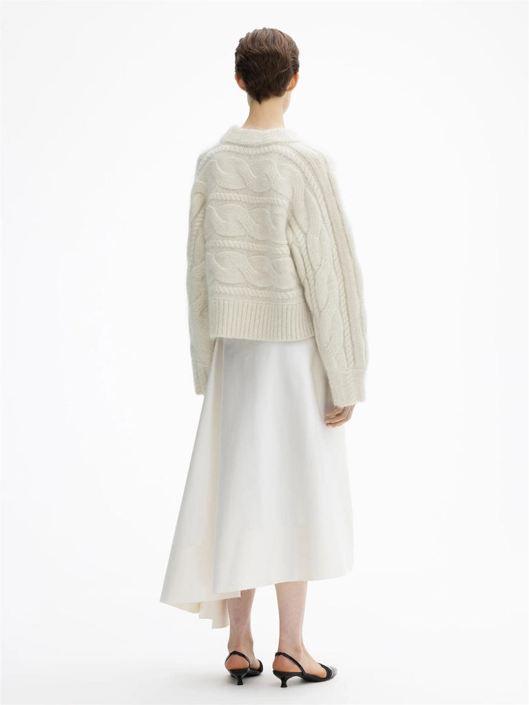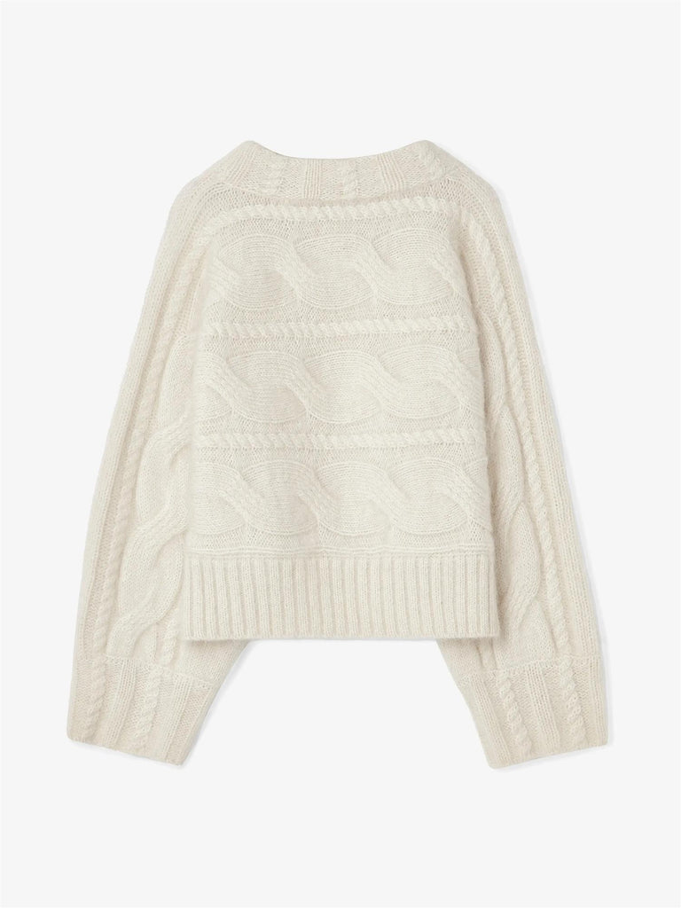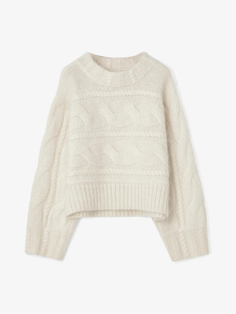 Tykk strikket genser i en myk mohairblanding, med en avslappet, boxy passform, brede ermer og et horisontalt kabelmønster. Akkompagnert av en subtil metallisk glans.