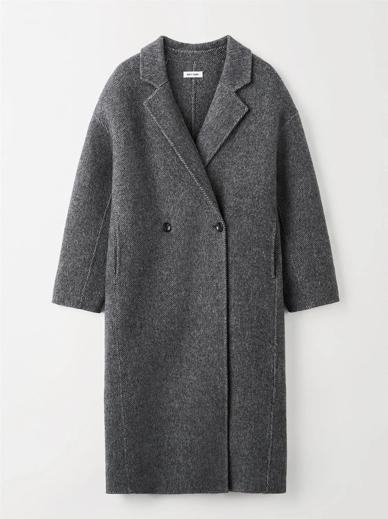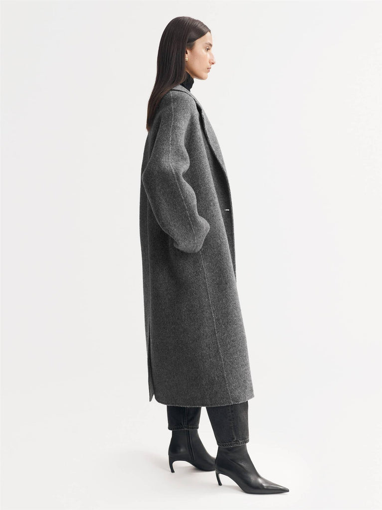En lang dobbelspent frakk i vevd herringbone-mønster i en ullblanding er et stilfullt og tidløst plagg som kombinerer både eleganse og funksjonalitet. Herringbone-mønsteret gir en subtil tekstur og visuell interesse, mens den dobbelspente designen tilfører en klassisk og sofistikert silhuett.