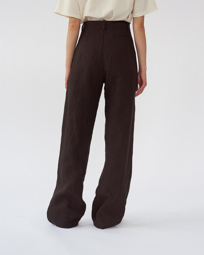 Naturlige linbukser i box-fit med folder, to sidelommer og en baklomme. skjult hempe, tortoiseshell-knapp og glidelåslukking. inspirert av herrebukser.