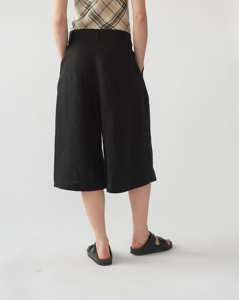 Oversized, vide lin culotter med to folder på hvert ben. de har to sidelommer og en baklomme. skjult hempe, tortioseshellknapp og glidelåslukking. inspirert av herrebukser.