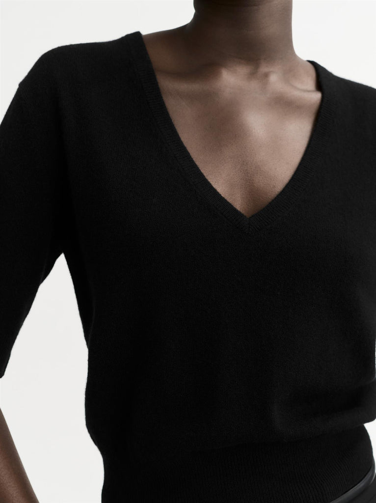 Denne kortermede T-skjorten er laget i 100% kasjmir og har en klassisk V-hals. Den enkle strikken gir et stilrent og komfortabelt uttrykk, perfekt for både hverdag, fest og avslappede anledninger.