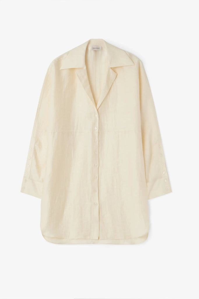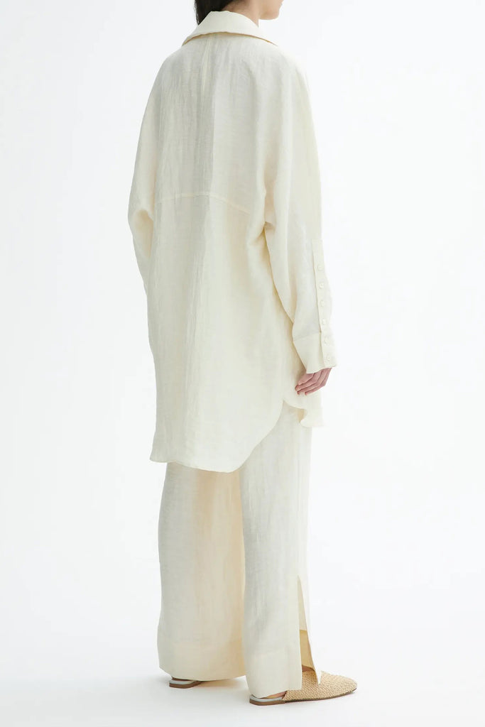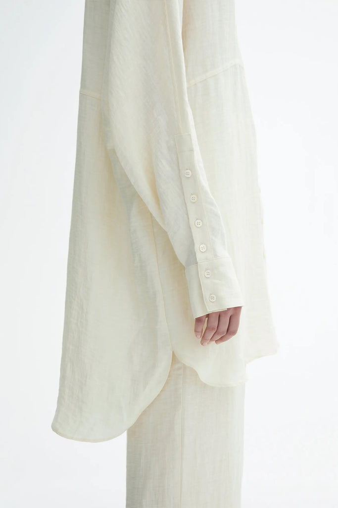 Oversized og flowy skjorte i myk, teksturert lin-blanding. Lang silhuett og avslappet resort-hals.