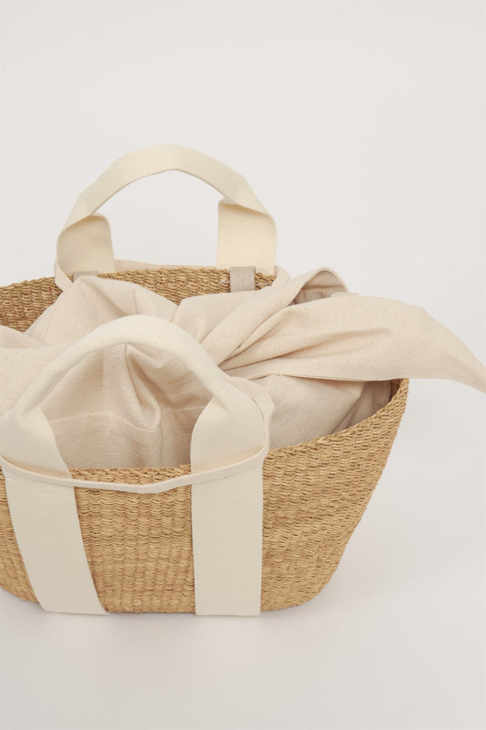 Stråveske med hanker i bomull og tilhørende bomullspose.