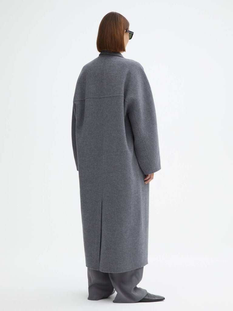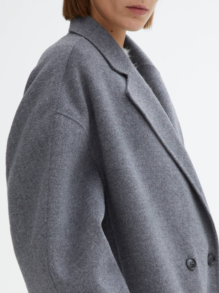 Denne ullkåpen fra Dagmar er dobbeltspent og ufôret, for en avslappet look med lett bevegelse.