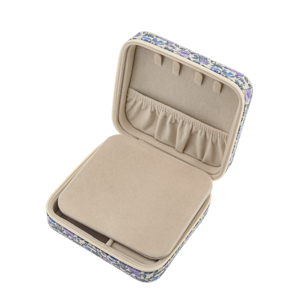 Skjønt smykkeskrin fra Bon Dep i libertystoff. Målet på smykkeskrinet er bredde x høyde x dybde, 14 x 5 x 13 cm.