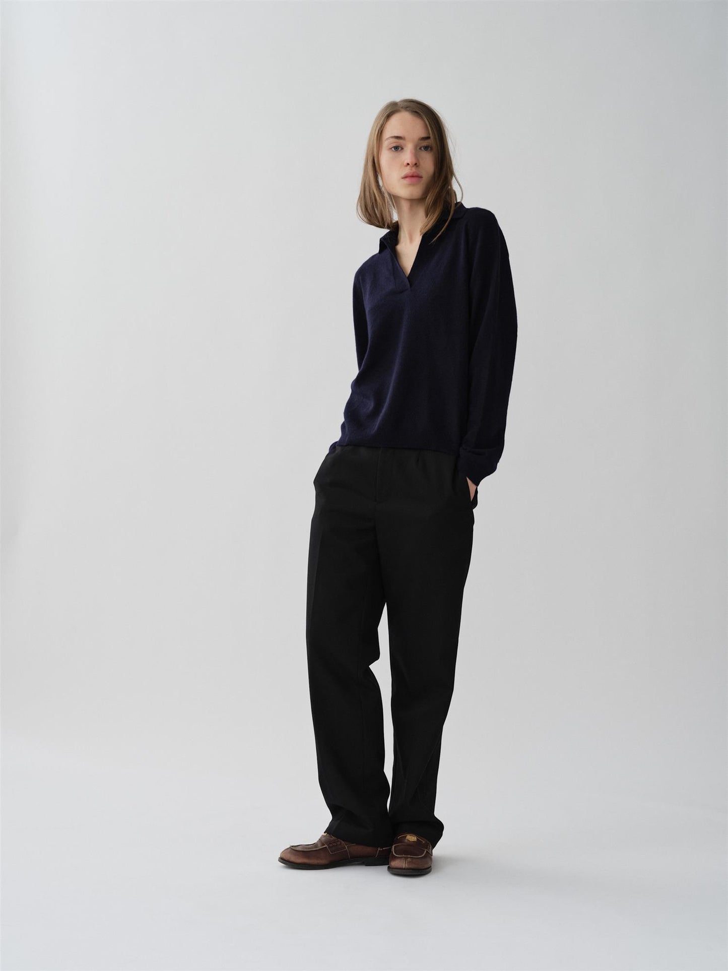 Women's Oversized Collar V-Neck i fargen Navy Blue er strikket i 10-gauge, 100 % Grade A kashmir fra Indre Mongolia, og har en avslappet, boksete passform med åpen krage for et uanstrengt stiluttrykk. Dette allsidige plagget balanserer komfort og raffinement, og fungerer like godt alene som i lag-på-lag. En flatterende og ledig silhuett gjør den perfekt for hverdagslig eleganse.