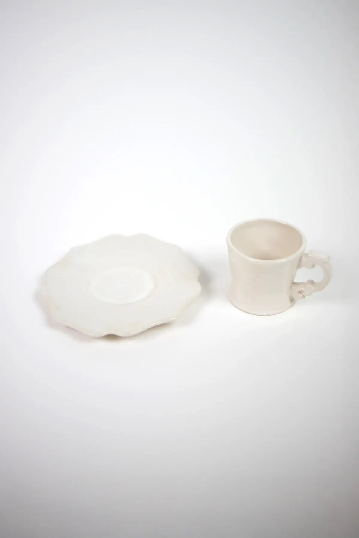 Koppen har myke kurver og et sart uttrykk, mens fatet fungerer som en praktisk og dekorativ base. Perfekt for både hverdagsbruk og hyggelige kaffestunder, enten alene eller i selskap.