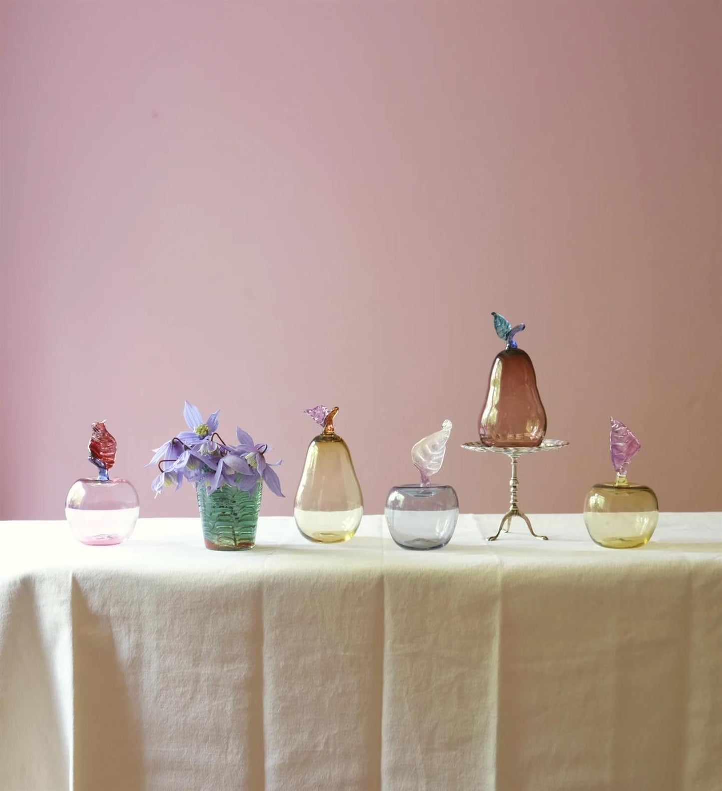 Denne papirvekten er munnblåst og håndlaget i glass i Danmark, og skaper et skulpturelt og poetisk uttrykk som bringer naturens former inn i hjemmet. Formen er inspirert av fruktene i Mariannes hage nord for København – et sted hvor magnoliaen slipper bladene før klematisen kommer, liljer og roser følger hverandre gjennom sesongene, og til slutt gir fruktene sin rike overflod. Det er denne hagehistorien og Mariannes personlige tilknytning til landskapet som ligger til grunn for designet.