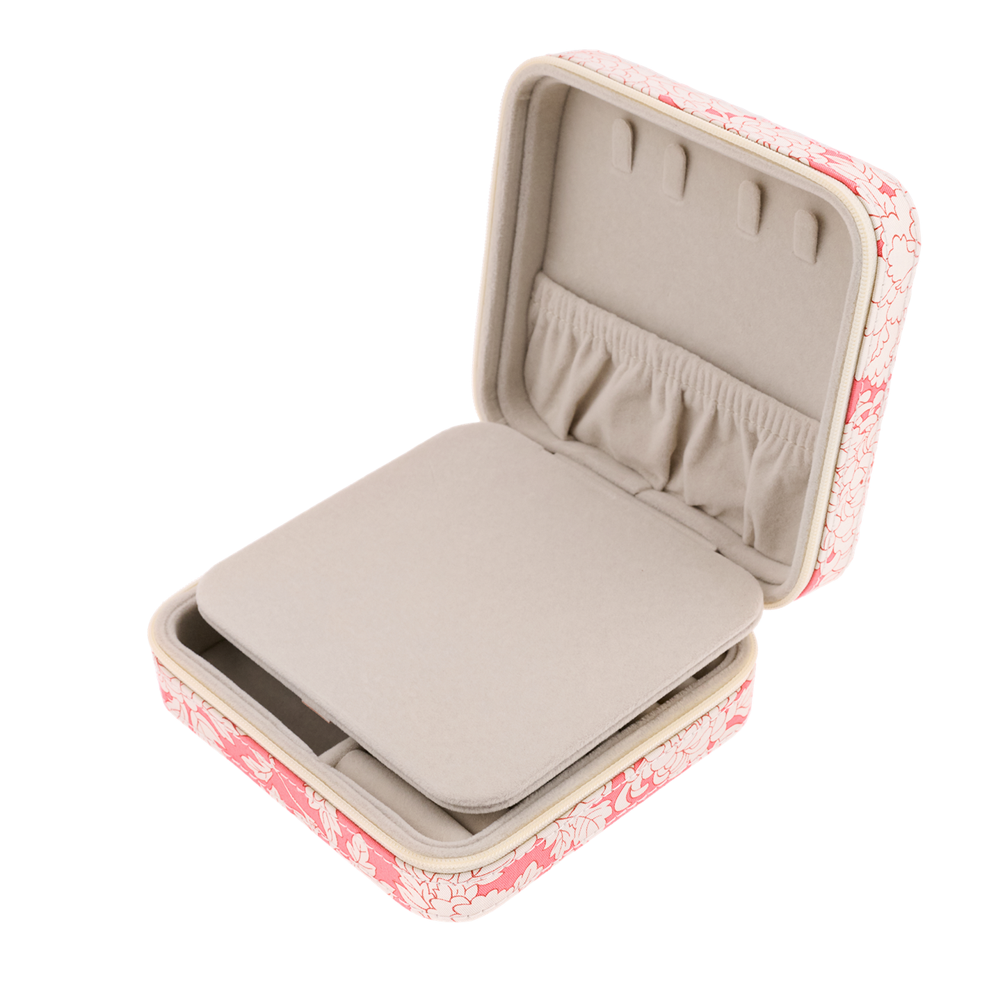 Skjønt smykkeskrin fra Bon Dep i libertystoff. Målet på smykkeskrinet er bredde x høyde x dybde, 14 x 5 x 13 cm.