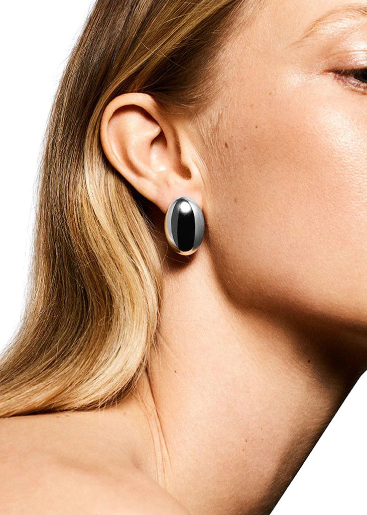 En oval ørering med myke og klassiske former, designet med inspirasjon fra antikke silhuetter. Produsert i sterling sølv og med sommerfugl-lukking bak.