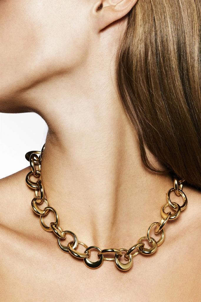Chunky halskjede laget av gullbelagt messing. Kjedet sitter behagelig tett inntil halsen og kan justeres i lengden.